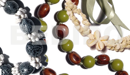 Aloha! Hawaiian leis in myriad of designs and colors made from kukui nut, seeds, mongo shells, nassa shells, cowrie shells, sigay, mussels and a whole lot more in ribbons!