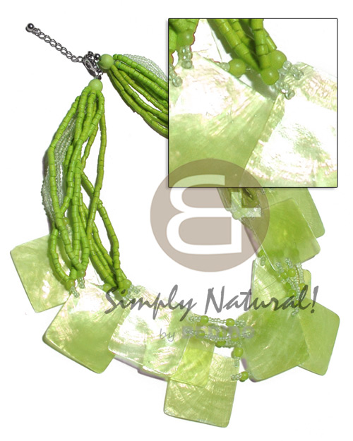 12 layers in 3 graduated rows of 2-3mm coco heishe & glass beads w/ 11pcs. of 35mm laminated capiz / 14in/15in/16in / yellow green tones