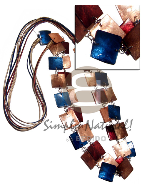 6 layers satin cord w/ double row 34 pcs. square 25mm laminated capiz in metal rings/ 40in / in copper, dark blue and maroon tones