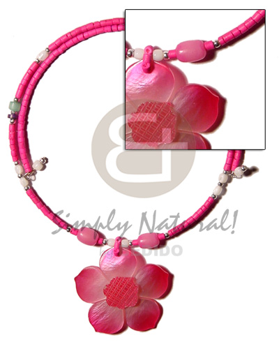 Pink 2-3mm coco heishe wire choker w/ buri & troca beads accent w/ 45mm pink hammershell flower pendant
