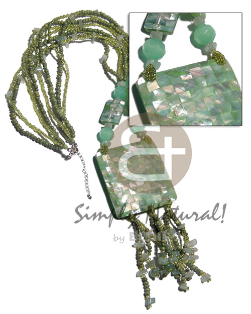 4 rows glass beads, 2-3mm coco pklt w/ stone nuggets, 2 pcs. rectangular 20mmx15mm mint green hammershell blocking w/ tassled 55mm mint green square hammershell blocking pendant / green tones / 22in plus 2.5in tassles