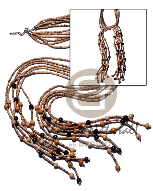 Scarf necklace - 6 rows 2-3mm coco heishe tiger w/ 8mm asstd. round wood beads accent / 44 in.