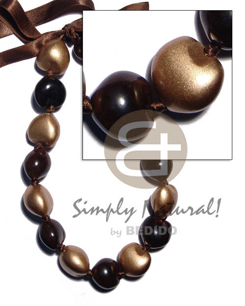 Brown kukui nuts w/ alternate kukui in gold ( 16 pcs. ) / adjustable ribbon