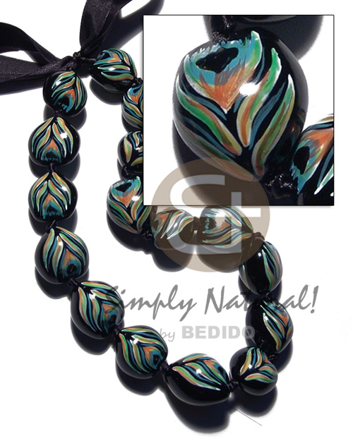 Kukui Nuts Ribbon Peacock Hand Painted Lumbang Seed Kukui Lei Necklace BFJ3105NK