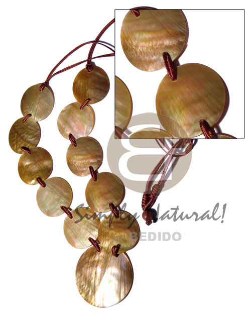 10 pcs. 35mm round brownlip shells & 1pc. 50mmround brownlip shell center accent in satin double cord / 40 in.