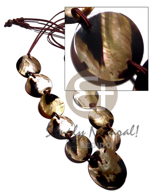 10 pcs. 35mm round brownlip tiger shells & 1pc. 50mm round brownlip tiger shell center accent in satin double cord / 40 in.