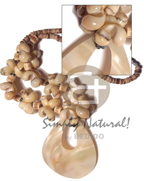 4-5mm coco tiger pklt w/ crème moon shell /sig-id wood combi and 65mmx50mm teardrop kabibe pendant / 20in