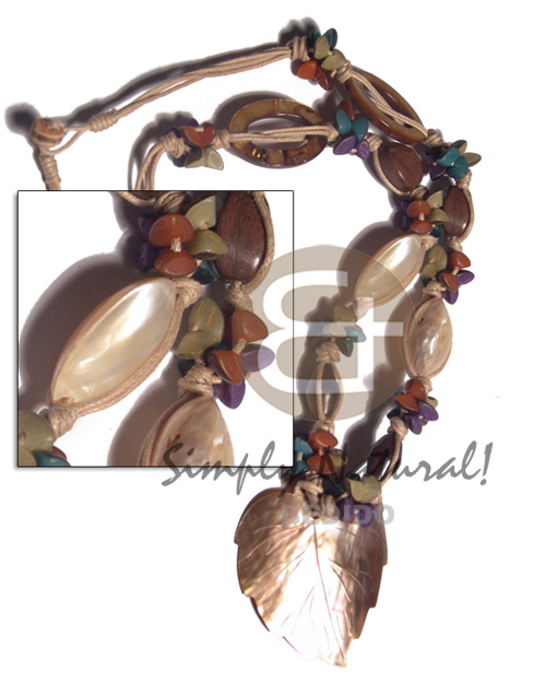 4 rows beige knotted wax cord w/ multicolored buri seed nuggets, wood beads, gold mouth shell and laminated oval kabibe shell rings w/ brownlip 50mmx45mm leaf pendant / knotted loop lock w/ coco stopper /20in