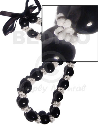 22 pcs. black kukui nuts w/ white mongo shell rings / in matching adjustable ribbon w/ the maximum length of 54in