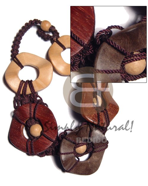 Macrame choker w/5pcs. 42mm wavy round nat. wood beads varied wood tones / 14in