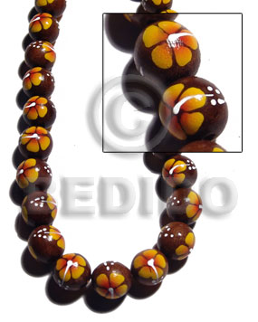 15mm 27pcs. madre de cacao round beads w/ handpainted back to back yellow / orange / white flower