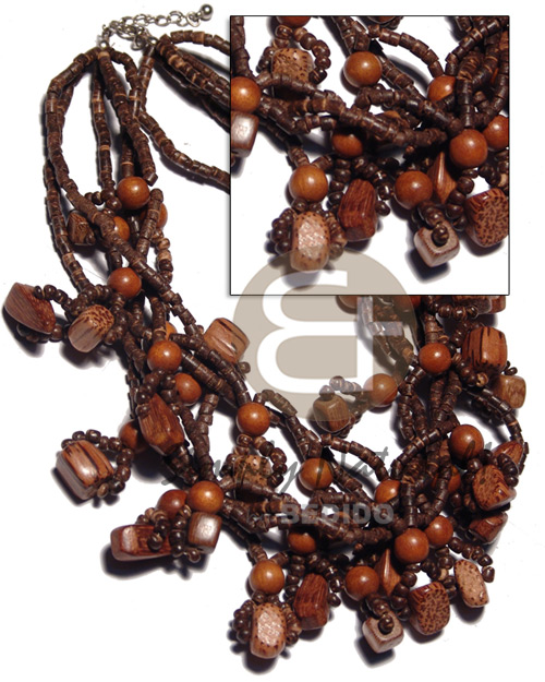6 rows 2-3mm nat. brown coco heishe w/ asstd. looped bayong and palmwood beads / 16in