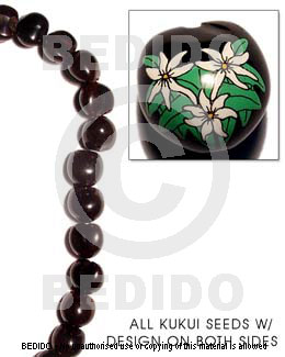 Kukui Seed / Black W/ Flower Design On 2 Sides / 16 Pcs. Per Strand