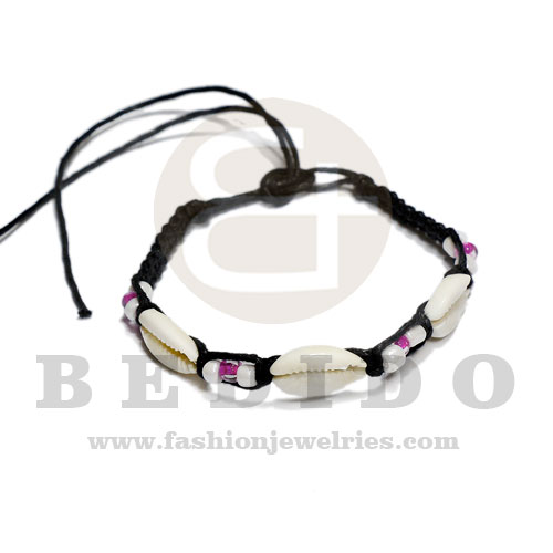 Friendship macrame bracelet black with violet white tones beads w/ 3 pcs. sigay cowrie shells / adjustable