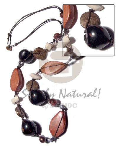 2 layers knotted wax cord w/ asstd. wood beads- 40mmx20mm flat freeforem wood,20mm coco pklt w/ kukui nut /32 in.