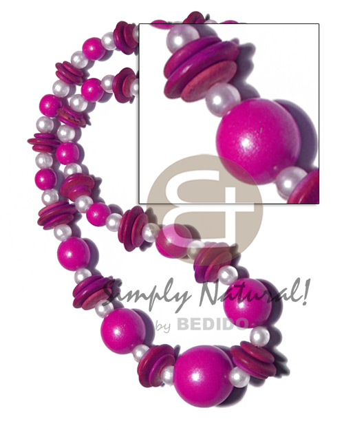 Graduated wood beads 25mm/20mm/15mm/10mm in w/ pearl beads accent / fuschia tones / 21 in.