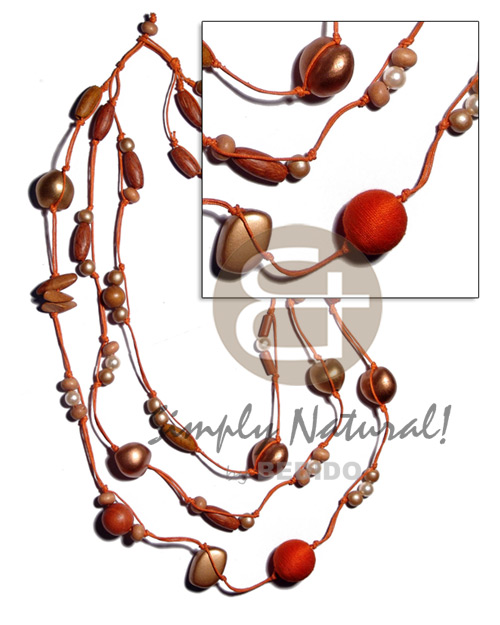 3 rows 16" 17" 18" wax cord w/ asstd. wood beads, pearl, wrapped wood bead, pearlized kukui nuts in orange.bronze tones