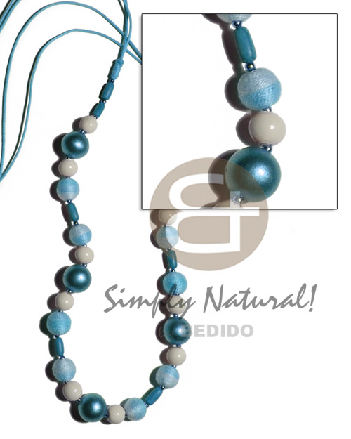 12mm wrapped wood beads w 15mm round, 10mm buffed bleached and ricebeads wood beads combi in double golden wax cord/ light blue tones / 36 in adjustable