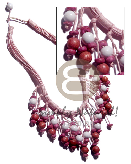Cleopatra / 15 r0ws wax cord w/ dangling 10mm round wood beads & 7-8mm coco pklt / pink and white tones