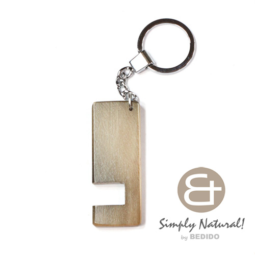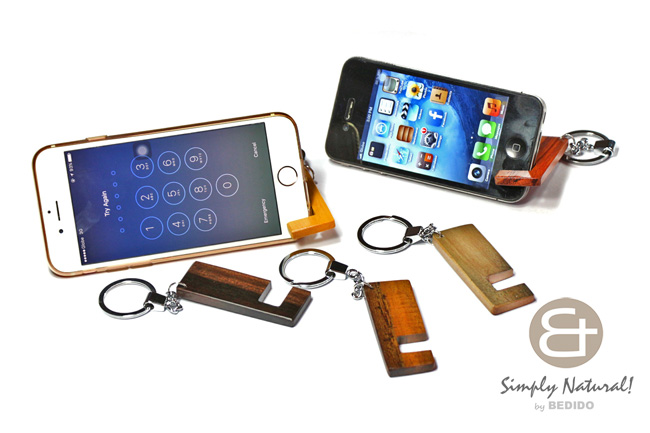 Natural wood stained in gray brown with semi gloss top coat phone stand in chrome keychain 64mm x 24mm x 5mm